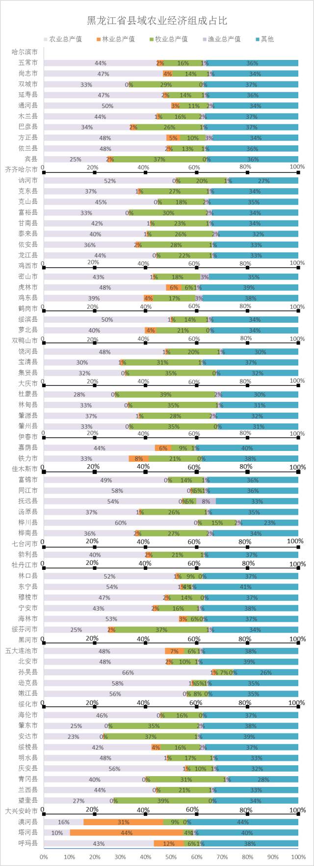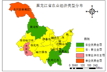 通观黑龙江省各县域农业经济组成百分比数据,我们可以将所有县域分为四种类型:农业优势主导型、农、牧业主导型、农牧业并行主导型、林业优势主导型。其中属于农业优势主导型的有鸡西市、牡丹江市、黑河市;属于农、牧业主导型的有哈尔滨市、齐齐哈尔市、鹤岗市、双鸭山市、伊春市、佳木斯市、七台河市、绥化市;属于农牧业并行主导型的是大庆市;以林业为优势主导的是大兴安岭地区。