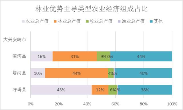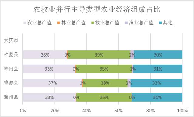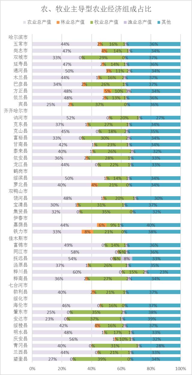 农业优势主导型区域农业总产值占比基本为50%左右,个别县域例如孙吴县可达66%,属于明显农业主导的农业经济组成地区。