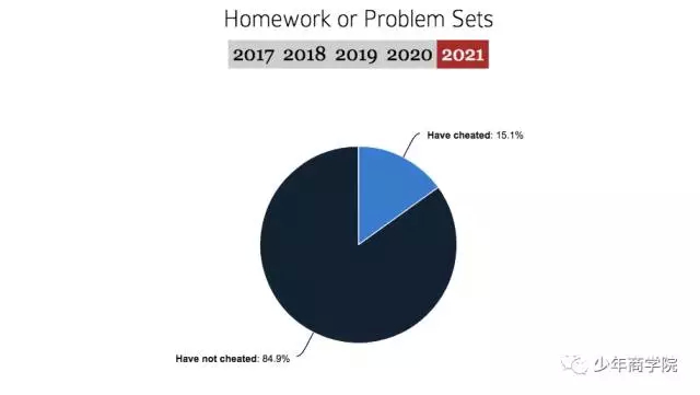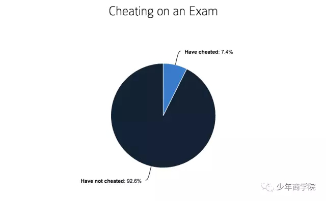 有7.4%的受访学生坦言曾经在考试中作弊,7.3%学生在论文上作弊,15.1%的学生在家庭作业上作弊。不过,幸运的是,作弊的比例正在逐年下降,今年是5年来的最低点。