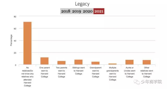 70.7%的受访学生表明,家族中不曾有过(以及不曾听过)近亲是哈佛毕业生,12.1%的受访学生表示,父母中至少有一人是在哈佛毕业。