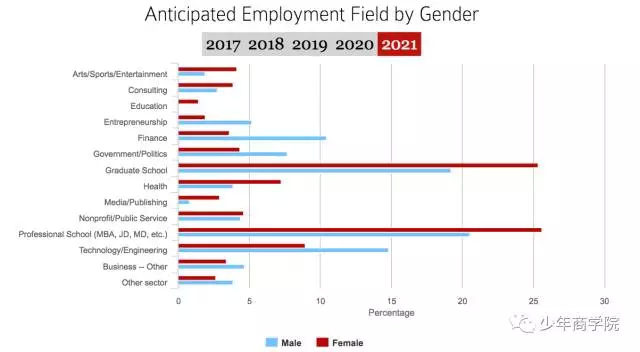 最受男性学生欢迎的前三种毕业去向是:专业类研究生、学术类研究生、从事科技与工程类工作;最受女性学生欢迎的前三种毕业去向分别是:学术类研究生、专业类研究生、从事科技与工程类工作。