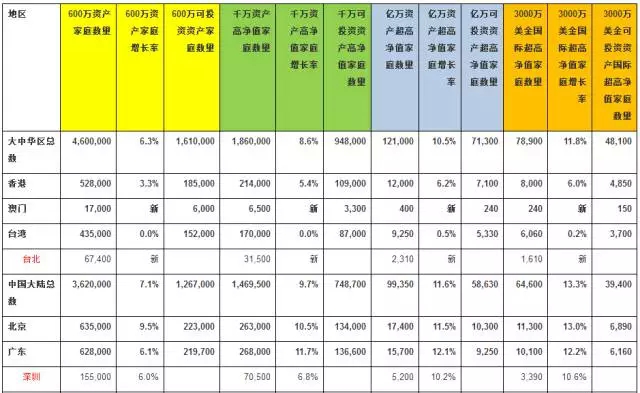 大中华区600万资产、千万资产、亿万资产和3000万美金资产家庭地域分布