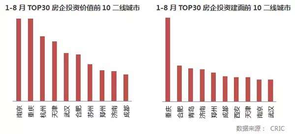 从单城市来看,投资价值前10城市尤为受房企青睐,占到TOP30房企二线城市投资额的75%。南京、重庆、杭州、天津四座城市对于房企投资吸引明显,位于投资价值前4位,与之后的城市明显拉开距离。在房企土地投资建面的城市排名来看,多数城市之间相差不大,较为突出的为重庆,因该市一直所奉行积极的土地政策所致,另一方面也反映出该市的市场容量较大的特点。