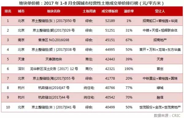 地块榜:总价榜央企优势明显,单价榜强强联手