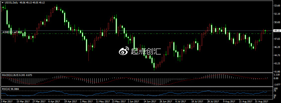 从日K线图上显示美原油价格昨日基本维持高位整理价格再次尝试冲击50未能成功连续2日未能突破上方阻力。今日早盘平开整理日内再次尝试冲击50一线。从技术指标上看MACD下行的动能仍在持续但动能较弱对空头指引不大。