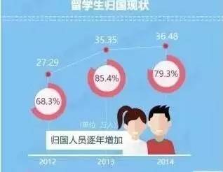 2012年当年留学回国人员已达27.29万人,同比增长46.56%,占当年出国留学人数的70%左右,形成了“史上最大的回国潮”。2013年,回国的留学人员再创历史新高,达到35.35万人,比2012年又增加了29.53%,也就是8.06万人,相比之下,当年的出国留学人数仅增长3.58%。