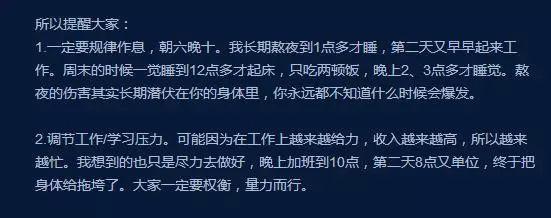 在后续中他提醒了大家不要熬夜,作息规律。我们可以观察她以下图片中的两个提醒。