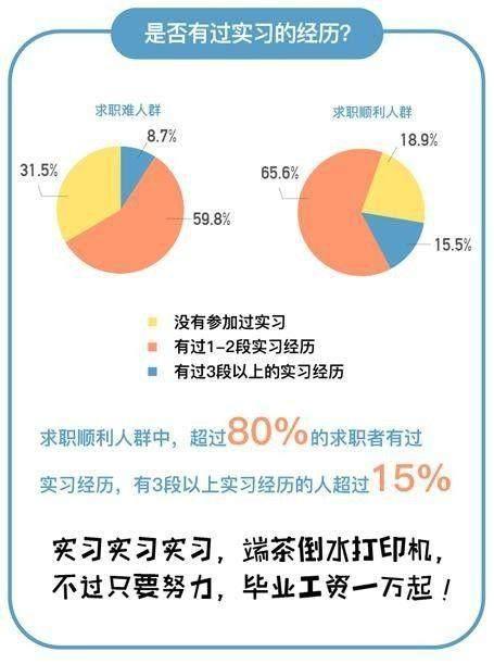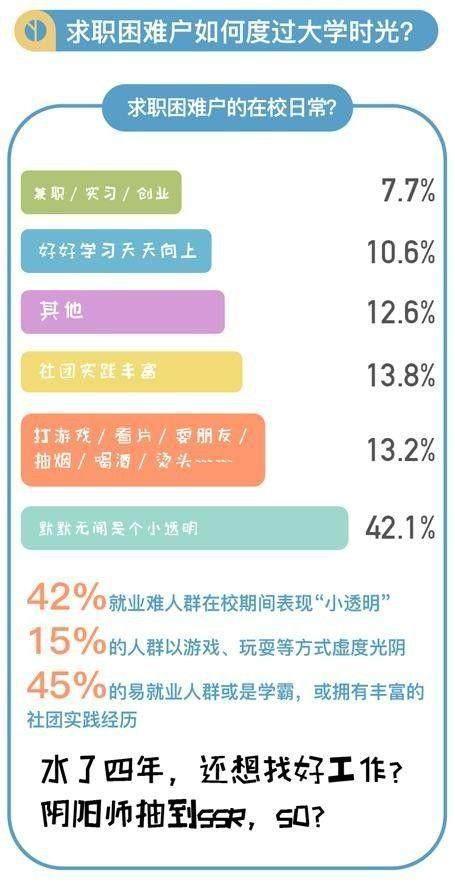 2.对“大学隐身族”说不。据报告显示,就业难人群中,超过55%的人群认为自己在大学期间并无存在感,通过打游戏、看电影、玩乐等方式度过了大学生活;而对于顺利求职的人群而言,以这种方式度过大学生活的人群比例降到了30%,并且他们当中45%人表示在校期间或是学习成绩优异,或是拥有丰富的社团生活与实践经历