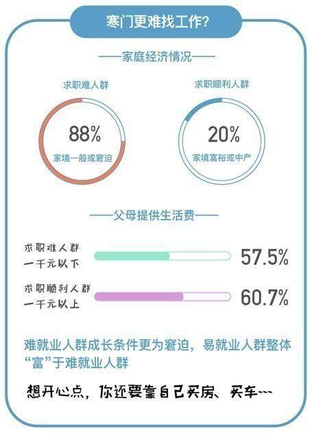 “农村地区的孩子越来越难考上好学校,现在的状元都是这种,通俗来讲,就是家里又好又厉害的这种。”今年北京高考文科状元的一段话,戳中了很多人的心,也引发了公众对教育“阶层固化”论的担忧。而这次的抽样调查报告也显示:除了入学阶段,就业阶段求职难易与家庭条件存在一定负相关关系。求职难人群的成长条件更为窘迫,88%以上的求职难人群表示自己的家庭经济状况为“冻不着,吃得饱”或“比较窘迫”;而求职相对顺利的人群中,超过20%以上表示,自己的经济状况为“有点闲钱”或者“非常富裕”;而从被调查人群“学生时期父母提供的生活费处于什么水平”这个指标来看,也侧面印证了这样的观点,求职难人群中超过57.5%的人表示,生活费在1000元以下,而求职顺利人群中60.7%的人生活费在1000元以上。