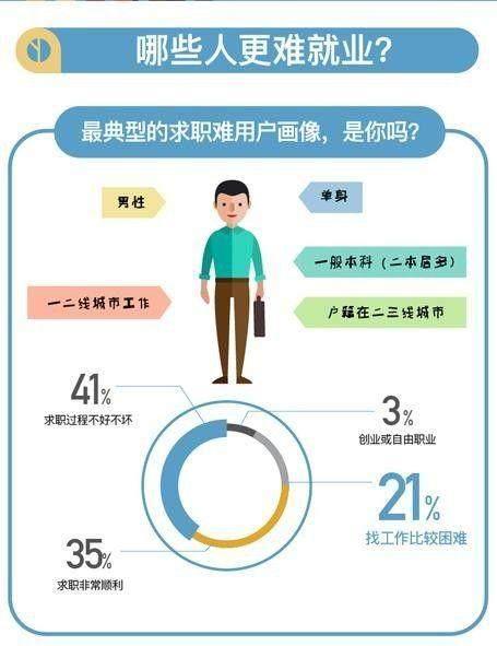 人群画像方面,数据显示这个群体主要为男性,学历主要为一般本科(二本居多),他们找工作的目的地大多为一二线城市,但却主要来自于二三线城市。另外就业难人群中单身比例更大,单身人群占比超过71%;对比来看,就业比较顺利的人群单身者只占50%,而已经结婚的比例也达到了近7%。