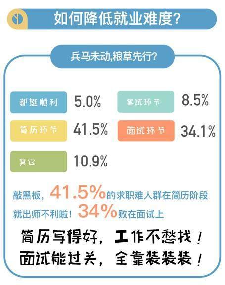 1. 细节很重要,重视求职的两端。这次调查报告中发现,就业难人群求职失败更多不是发生在笔试环节,求职过程中的前后两个环节——简历环节、面试环节被刷比例明显更高,表示问题出在简历环节“投出的简历大多石沉大海”的占到了41.5%,表示问题出在面试环节“面试总发挥不好”的占到了34.1%,而“笔试之后就没有下文了”的只占到了8.5%。