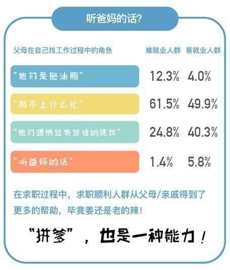 相对比较良好的家庭条件,也给求职者们提供了更多的选择空间或者人脉资源。报告显示,求职人群中选择“创业/自由职业”这部分的人群中家境不错的占比高,选择自己的经济状况为“有点闲钱”或者“非常富裕”的超过了一半;另外求职顺利的人群中,表示“家庭/亲戚提供了有价值的帮助或者建议”的占比超过了40%,而求职相对比较困难的人群,这个比例下降到了不到25%。