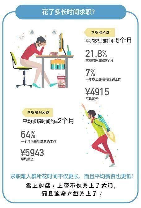2017年《中国大学生就业难人群画像报告》显示:被调查人群中有超过21%的大学生找工作比较困难,平均求职过程接近5个月;超过35%的大学生求职非常顺利,平均求职时间仅2个月。令人揪心的是,求职难人群的平均心理薪资要比求职顺利者的平均薪资要低1000元左右。