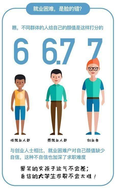 值得一提的是,报告中还特意安排参与调研的求职者们对自身的颜值/气质/身材进行自行评分,其中选择自主创业者人群给自己出了最高分,而就业相对比较困难的人群对自身的外貌评分最低。网易云课堂数据分析师认为,就业难人群对自身外貌的低评分或许是基于事实,也或许是被调查者不自信或者更为内向的表现。