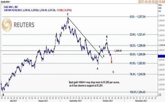 关于金价后市走势,路透大宗商品与能源市场技术分析师王涛指出,现货金XAU=或进一步跌至每盎司1,263美元,因其已跌破1,281美元的支撑位。