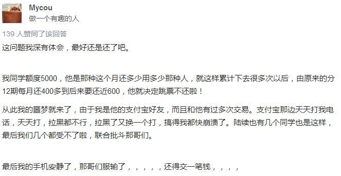 那么花呗、借呗还不上,到底有什么后果呢?小编在知乎上看到一位网友“Mycuo”的现身说法,说他快被花呗搞崩溃啦。但借钱的人居然不是他,而是他的室友。
