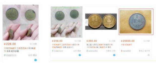 在淘宝上输入“80版贰角硬币”,跳出相关卖家仅4家,其中价格分别为228元、258元、260元、25000元,并且全部显示0 人付款。然而,在2011年,据法制晚报记者文章,当时在键入“80版贰角硬币”后,有43家店铺显示,最低标价仅88元,而最高标价则达到5万元。