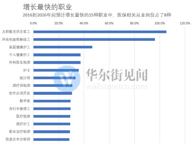 在名列前茅的15种职业当中,有多达8种岗位与医疗保障行业息息相关。2016年个人健康护工的中位数年薪为21920美元(约合14.5万人民币),而外科医生助理的薪资水平则高达101480美元(约合67.4万人民币)。未来十年这些医保相关岗位大都将迎来逾30%的薪资增长。随着美国60年代婴儿潮一代人逐渐步入晚年,夕阳产业的增长潜力不可估量。