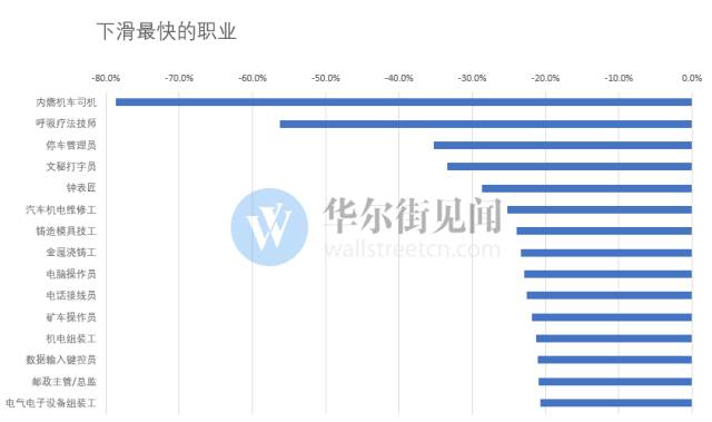 其中损失最为惨重的内燃机车行业,几乎要被高铁新技术全面挤压殆尽,未来十年预计薪资水平将大跌78.6%。制造产业链上,从铸造模具到金属浇铸再到电气设备装配维修,预计薪资水平全线重挫逾20%。