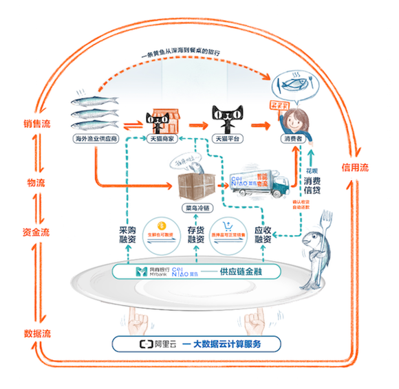 据了解,阿里供应链金融是由菜鸟和网商银行联合建立的数据和技术驱动的供应链金融服务协同平台,进一步通过数据化,打通了企业线上线下各环节,将商流、物流、资金流、数据流、信用流“五流合一”,让原本只有大宗商品、数码家电才能使用的“高大上”的供应链金融,实现了对快消品、生鲜品品类的全面支持。