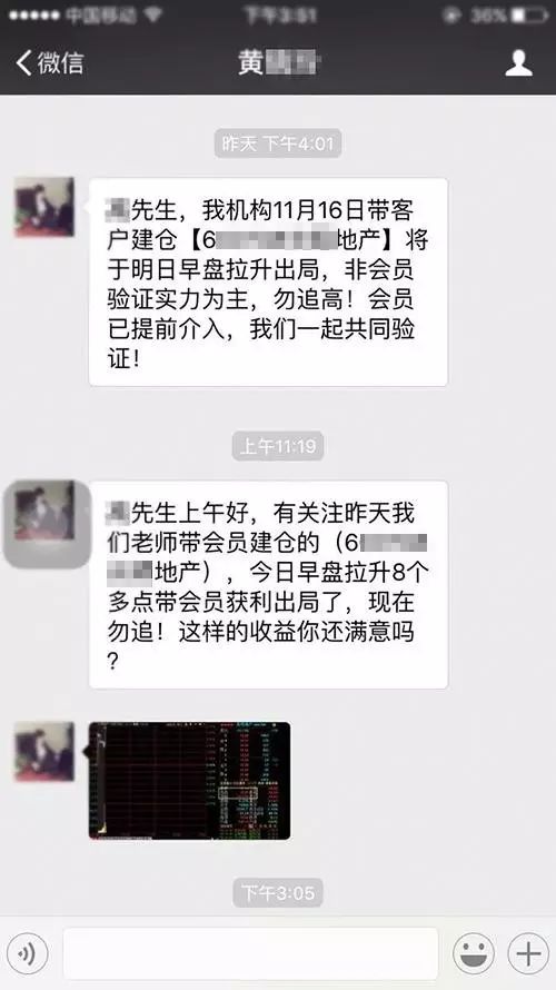 如自称“XX投资”的机构,通过微信朋友圈,在每天上午开市前和中午休市期间发布信息,宣称拟拉抬某股票,投资者向该机构缴纳一定费用后,可通过微信或者电话提前得知买卖该只股票的信息。投资者缴纳的费用,从15800元到58800元不等。