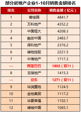 根据克而瑞研究中心此前发布的《2017年1-10月中国房地产企业销售TOP100》排行榜显示,共有12家房企销售金额超过1000亿元。而阿里和京东仅凭“双11”的销售额就足以挺进房企前十,这还没有计入其今年前十月的销售额度。