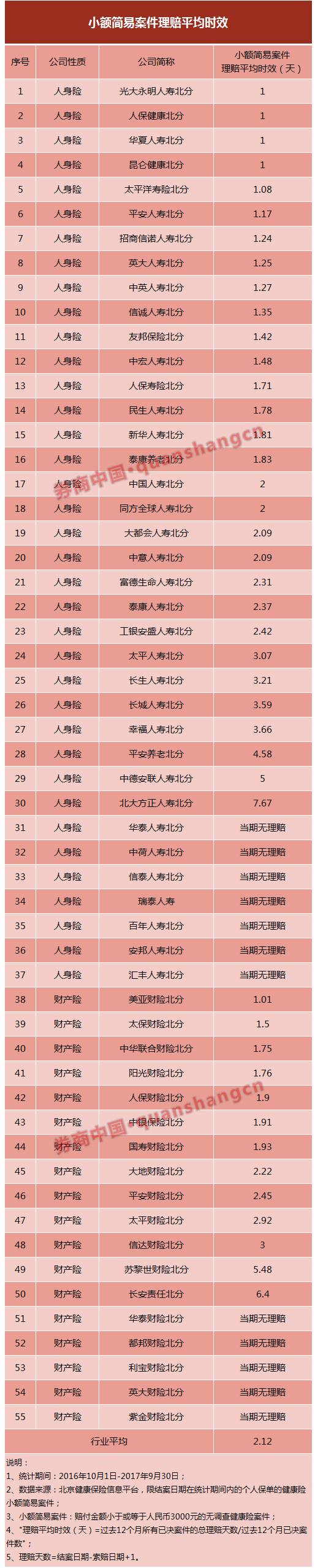 纳入统计的55家保险公司北京分公司中,除有12家当期无理赔外,其余险企整体的小额简易案件理赔平均时间为2.12天。