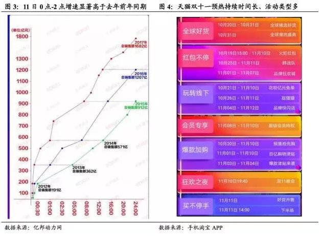 天时地利人和,打造最强双十一。天时地利人和三方面因素造就2017年以巨头天猫、京东、苏宁为首的龙头电商增速略超市场预期。天时:2017年的双十一是周六,不同于前几年双十一都在工作日,这使得消费者有足够的时间和精力去抢购,尤其是在双十一刚开始的几个小时,分时段来看,11日0点-2点增速相较于15、16年同期增速显著提高,周末“天时”条件造就凌晨交易额高增长。地利:近两年兴起的预售模式,开启时间也不断提前,天猫今年从10月20号就开始了双十一预售,预售期长达20天,而苏宁也开展了预售活动,预售订单在双十一集体爆发。人和:新零售元年下,线下线上融合达到了白热化,正在意义上实现了人场货的重构,晚会、足球赛等吸引眼球的活动叠加大规模的线下布局,这使得人们对于双十一的关注逐步升温,并在11日当天达到顶点。