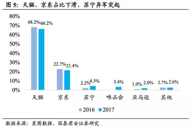 天猫、京东占比下滑,苏宁异军突起,龙头强者恒强。从市场份额来看,天猫仍然是绝对的老大,但份额有所下滑,占全网销售额比重同比下降2pct至66.2%。京东今年双十一的市场份额也出现了下滑迹象,按星图数据计算双十一当天销售额548亿元,占全网销售额的21.4%,同比下降了1.3个百分点。不同于天猫、京东份额下降的情况,苏宁今年双十一销售额占比达到4.3%,比16年的2.2%提升了近一倍,唯品会、亚马逊的销售额占比也有明显的提升,而16年排名4、5的国美和一号店已不见踪影。电商平台寡头格局逐渐凸显,伴随着消费者对于品质、品牌、服务等方面的愈加看重,龙头电商在品牌体系、营销渠道、物流供应链等方面有能力实现全面重构,品牌红利期竞争优势有望持续改善。