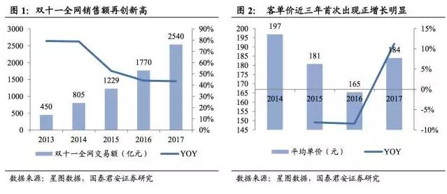 全天物流订单8.12亿件,客单价提升逐步凸显品牌与品质消费属性。2017年双十一全天订单量达到8.12亿件,相比2016年6.57亿件提升23.6%。按交易额除以订单量计算客单价为207元,相比2016年184元提升12.8%,由此管中窥豹,线上已由价格敏感性消费转型品质敏感性消费。