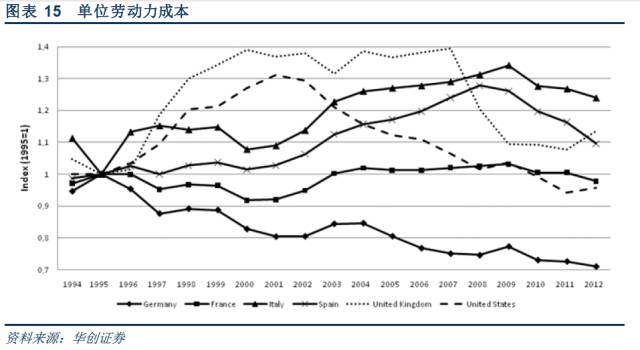 劳动力成本优势是德国实现出口突围的关键。单位劳动力成本,即经劳动生产率调整的薪资水平是衡量一国产业竞争力的重要指标。从单位劳动力成本来看,上世纪90年代初至今德国的相对竞争力在持续提升,法国基本持平,西班牙和意大利等国则在弱化。德国之所以能保持劳动力成本的相对优势,得益于施罗德政府的改革,如通过《哈茨法案》削减高福利、鼓励兼职等,同时劳动力市场也在自发调整,如工会组织在高失业率和产业外迁至东欧的威胁下愿意接受和劳动生产率进步基本保持同步的薪资增长。