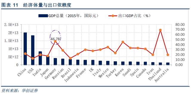 人口快速老化和高租赁占比使得德国很难像英国和西班牙那样通过鼓励住房自有提振经济增长,德国选择了借道出口分享全球地产盛宴,这铸造了德国在稳定的房价之外又一个重要的特征:大国经济、小国出口。就其经济体量而言,德国无疑是全球经济大国,但高达47%的出口依赖度通常只有小型开放经济才能实现,与其经济体量极不相乘。