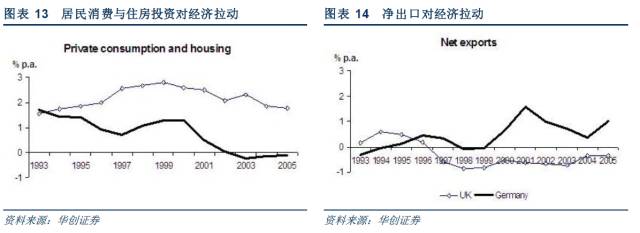 出口成为德国经济主要拉动力,消费持续低迷:90年代初,德国和英国两国居民消费与住宅投资对各自经济增速的拉动基本持平,英国的相对高增主要来自出口和非住房投资。之后居民消费与住房住宅对德国经济的拉动震荡下行,2002-2006年已滑落为负向拖累,对经济的拉动主要转为出口;这与英国截然不同,净出口对英国经济的拉动从1999起就转为负值,而居民消费和住房对经济的拉持续保持在2-3%的高位。