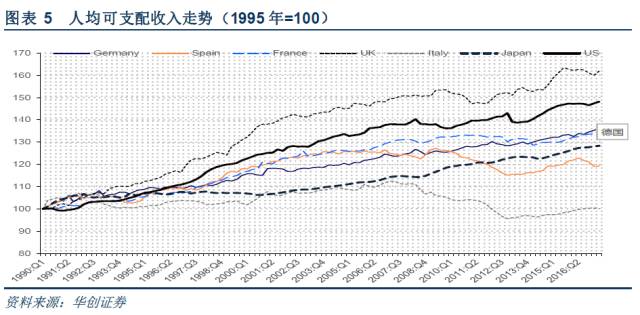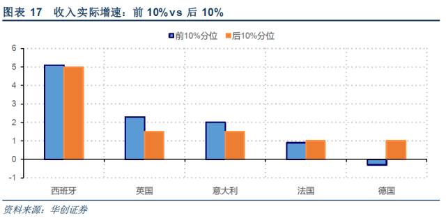 在劳动报酬占比整体走低的同时,收入分配也趋于恶化。作为传统的高福利国家、且拥有庞大的中产阶级,德国的收入不平等程度在欧美处于较低水平、但边际上不平等程度在加剧。1995-2005年,德国前10%分位家庭实际收入年均增长1%,虽不及西班牙5%的高增,和英国、法国以及意大利基本相当;但同期后10%分位家庭实际收入年均下跌0.3%,远不及上述其他三国,是四国中唯一录得负增长的国家。