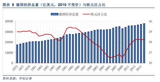 把时钟拨回到1995-2006年,德国又是另一番景象,曾在二战后创造经济奇迹并引领欧洲复兴的德国从上世纪90年代中叶开始经济增长持续乏力。1995年时德国不仅在经济总量上是欧洲第一大国,人均GDP也居欧洲前列,而在之后的10年间,虽然经济总量因庞大的人口规模始终领跑欧洲,但经济增速持续滞后于英、法、西、意等国,德国经济总量在欧元区的占比从34.5%下滑至2006年的26.8%。