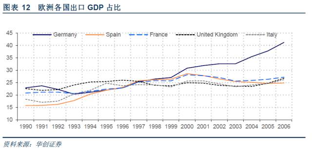 经济对出口依赖度快速攀升。上世纪90年代初,德国和西班牙、法国、英国的出口依赖度(出口GDP占比)均在20%左右,之后德国持续攀升,而西班牙、法国稳中略降,截止2006年,德国的出口依赖度已超过40%,法国、西班牙、英国依旧停留在20%的水平。在上述各国将劳动力和金融资源导向地产市场时,德国在全球贸易和制造业的地位得以巩固和加强,并借道出口得以分享他国的地产盛宴。