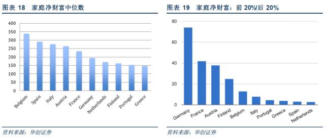 财富差距快速走阔:相比收入不平等在边际上的加剧,德国财富不平等程度从绝对水平上已居于欧洲前列。根据欧央行家庭财富调查的数据,欧元区各国中,德国家庭净财富(家庭财富-负债)的中位数(经家庭人口数调整)处于中等水平,但财富的分布是最不均等的。收入前20%的家庭,其占有的净财富是收入后20%家庭的74倍,远高于欧元区其他经济体,次高的法国也只有41倍。