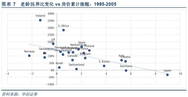 关于这一时间德国经济的相对疲软有诸多解释,如过高的福利、未能有效应对东欧的冲击等等,这里不再展开,我们重点关注和房价走势也密切相关的另一个因素:人口老龄化。1995-2005年,德国是全球人口老龄化速度最快的国家之一,2005年老人抚养比达30%,老龄化程度和日本、奥地利等国一道居于世界前列。人口的快速老化在制约经济潜在增速的同时也抑制了房价上涨,老人抚养比的变化对房价的变化有着非常强的解释力,从这个角度来观察,德国房价的滞涨并没有那么特殊。