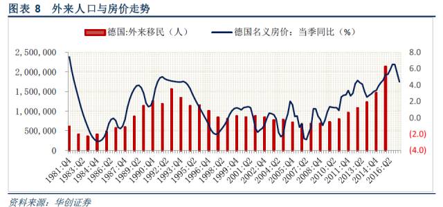 经济的持续相对疲软也削弱了德国对移民的吸引力。德国住房制度在供给端很值得国内学习,通过在战后大规模兴建住宅,进入80、90年代住房供需在总量上已基本平衡,移民在边际上成为增量需求的主要来源之一,从而使得德国房价走势和新增外来移民的变化呈现同步的同步性。德国在这一时期对外来移民的吸引力大幅降低,新增移民数量不及19995年,和英国、西班牙以及法国等国移民高增形成鲜明的反差,这也在一定程度上抑制了房价的上涨。