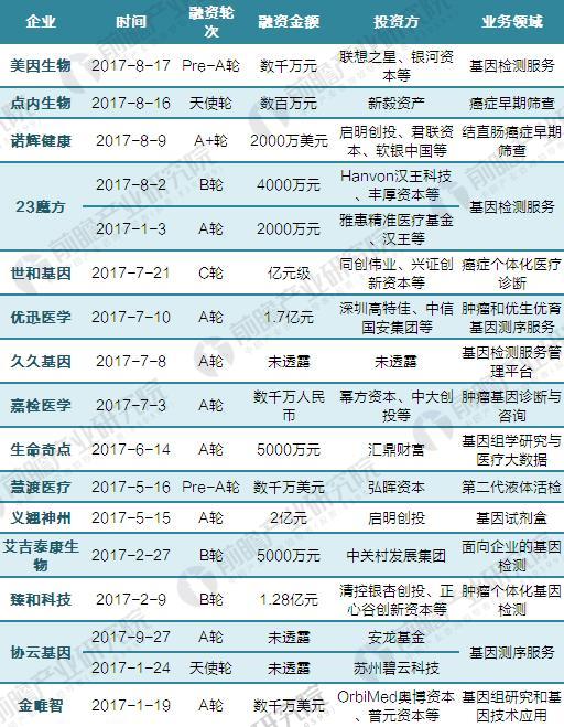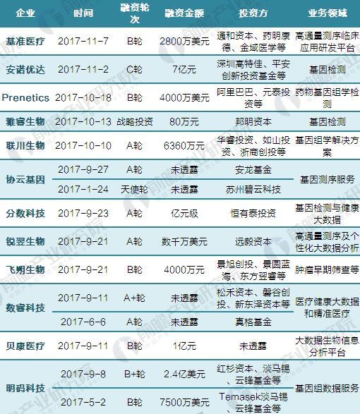 国内目前已有超过230家从事基因检测相关业务的企业和机构,其中70%左右的企业主要提供第三方基因检测服务。据前瞻产业研究院发布的《2017-2022年全球精准医疗行业发展前景预测与投资战略规划分析报告》不完全统计,2017年1-10月共计27家国内基因检测领域的公司宣布完成32轮融资(不包括上市),其中明确披露具体融资金额的有25笔,未明确披露金额的有7笔,明确融资金额事件共获得融资总金额达50.86亿元,其中单笔融资金额超过亿元人民币的有15笔。