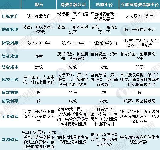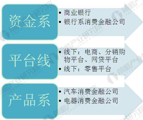 资金系主要依靠资金成本优势提供消费金融服务,主要包括商业银行和银行系消费金融公司;平台系是指主要以用户流量为支撑的消费金融服务提供商,包括线上的电商平台、分期购物平台和网贷平台以及线下的零售商平台;产品系依靠产品品牌等优势,掌握消费产品和服务端,主要包括汽车消费金融公司和电器类消费金融公司。