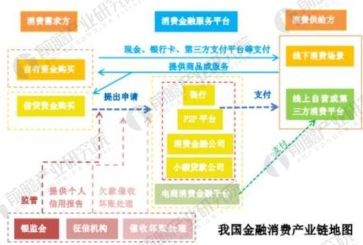 中国消费金融产业链分析消费金融生态圈包括核心参与者和外围服务提供方,其中核心参与者包括消费品提供商、资金提供方和消费金融需求方,外围服务提供方包括征信服务提供方、支付支持方、大数据营销提供方等。