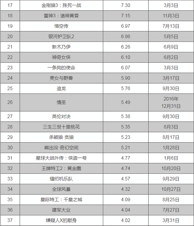 2017年5月6日,全国电影票房突破200亿,用时126天,虽比2016年提前16天,其中《速度与激情8》《金刚:骷髅岛》《极限特工:终极回归》《生化危机:终章》等进口片的集中登陆,成为助推市场的主要原因,其中《极限特工:终极回归》和《生化危机:终章》两片的内地票房,都远远超过了北美地区,成为全球最卖座市场。