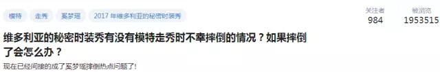 但是像奚梦瑶这样的事故,应该算是维秘秀历年之“最”,这是一场现象级的错误。知乎网友说是“活久见”,其实连奚梦瑶自己很早之前也都知道“摔倒”这件事的严重程度。
