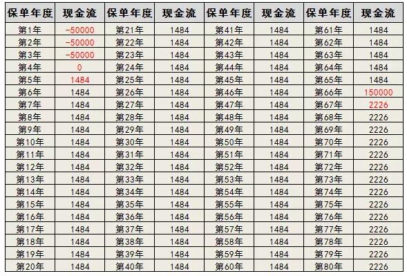 投保5、6年,每年领取2.5万;第7年到开始返还,每年返还1484元,直到64岁;65岁再返还15万元,66岁每年返还2226元,到终身。