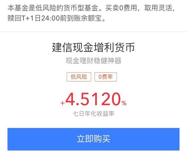 本质上余额宝其实也算是一种货币性基本,但是很多人不知道的是,在支付宝中其实可以购买其他种货币性基金,也是活期的(如果需要提现,当天下午三点前提现第二天24点之前到账到余额宝中)。跟余额宝相比,这种货币型基金年化收益率高,一般可以达到4.5%-5%,而且跟余额宝一样基本没有风险。比如小编正在使用的建信增利货币,年化收益4.5%左右。