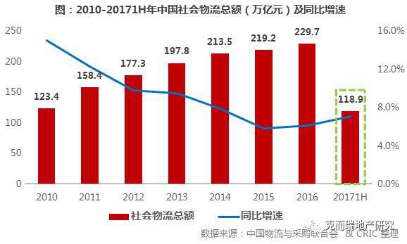 过去10年间,随着经济发展,物流地产迎来爆发式的增长,需求日渐旺盛。数据显示,我国物流地产整体市场规模从2005年的不足人民币3亿元增长到2016年的超过100亿元,社会物流总额不断增加,2016年我国社会物流总额 229.7万亿元,比上年增长6.1个百分点,2017年上半年全国社会物流总额为118.9万亿元,同比增长7.1%,增速同比提高0.9个百分点,物流市场规模保持较快发展态势,需求端稳中向好。
