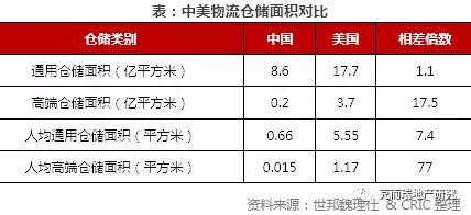 物流地产的发展得益于零售和电商行业的发展,2016 年美国、中国消费品零售总额分别为 33.4、24.9 万亿元,中国为美国的 74.5%,以中美商贸零售总额测算市场空间,中国合理高端仓储面积为 2.8 亿方,仍需增加 13 倍后才能够匹配消费带来的高端仓储需求。