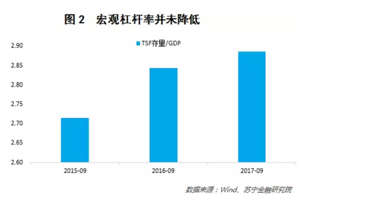 实际上,如果观察社会融资存量与我国名义GDP的比值的话,我国的宏观杠杆率并未得到有效控制,2016年9月社会融资存量与名义GDP的比率为2.84,今年9月提升至2.89(参见图2)。今年9月我国名义GDP增速为11%,从社会融资各分项的增速看,信托贷款和未贴现银票的增速还高于名义GDP增速,分别为35%和17%。因此要想杠杆率出现下降,必须要使社会融资存量增速低于名义GDP增速才行。