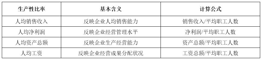 生产性指标分析的目的是判断企业在一定时期内的生产经营能力、生产经营水平和生产成果分配等,主要指标如表5所示。